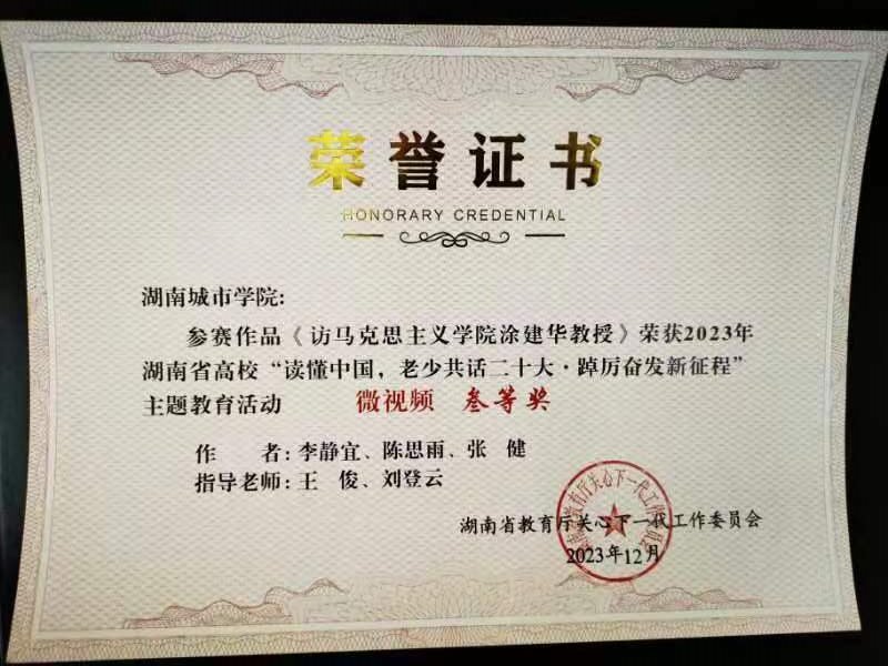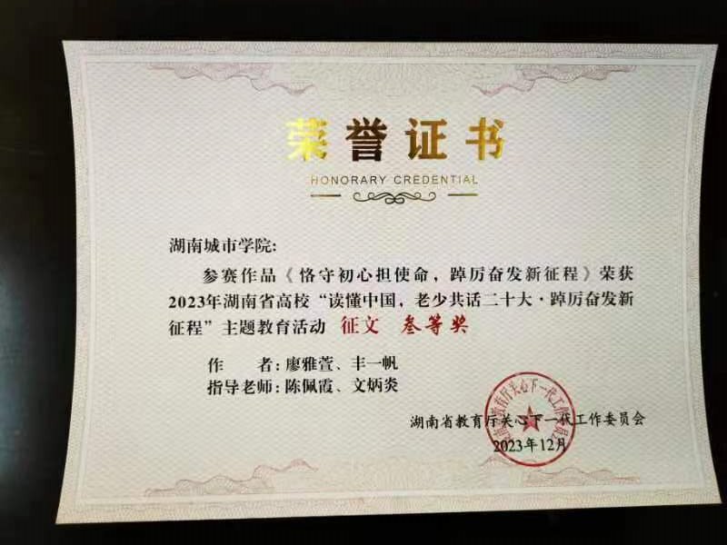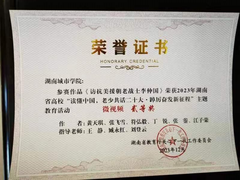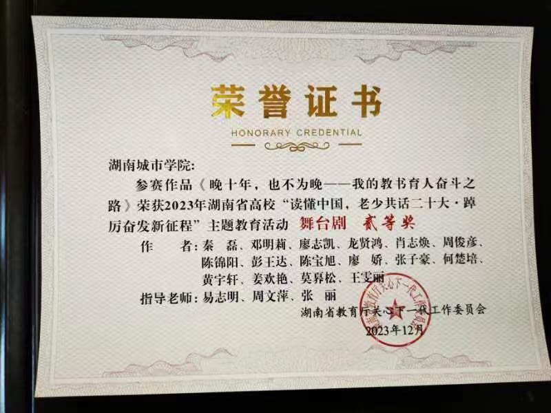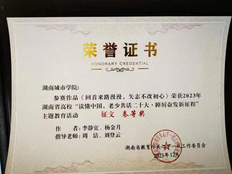 近日,湖南省教育厅关工委召开全省教育系统关工委工作会议,对全省高校“读懂中国,老少共话二十大·踔厉奋发新征程”主题教育活动进行总结表彰。我校荣获2023年省教育厅关工委“读懂中国”主题教育活动优秀组织奖,并在征文、微视频、舞台剧评选中共获一等奖1项、二等奖3项、三等奖3项。
