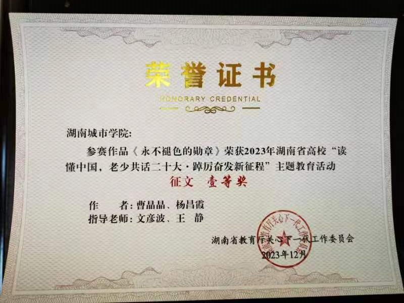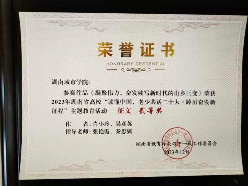 在此次活动中,由文彦波、王静老师指导,曹晶晶、杨昌霞撰写的征文《永不褪色的勋章》获得一等奖;由王静、臧永红、刘登云老师指导,黄天琪、江子荣、张飞雪等6人制作的微视频《访抗美援朝老战士李仲国》,由易志明、周文萍、张丽老师指导,秦磊等16人参与的舞台剧《晚十年,也不为晚——我的教书育人奋斗之路》,由张艳霞、秦忠翼老师指导,肖小玲、吴彦英撰写的征文《凝聚伟力,奋发续写新时代山乡巨变》均获二等奖;由陈佩霞、文炳炎老师指导,廖雅萓、丰一帆撰写的征文《恪守初心担使命,踔力奋发新征程》,由周洁、刘登云老师指导,李静宜、杨金月撰写的征文《回首来路漫漫,矢志不改初心》,由王俊、刘登云老师指导,李静宜、陈思雨、张健制作的微视频《访马克思主义学院涂建华教授》均获三等奖。