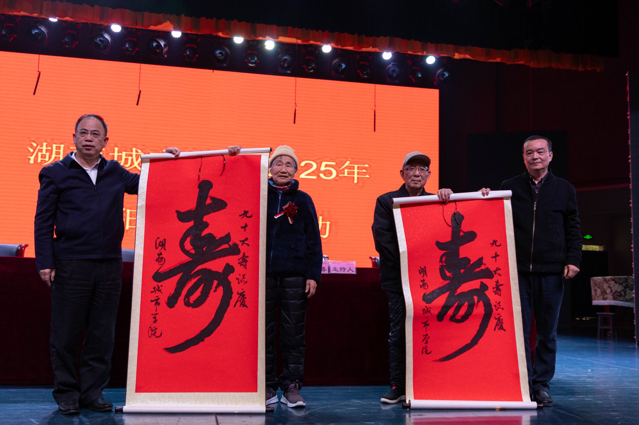 活动现场气氛喜庆祥和。与会领导给80、90岁寿星赠送“寿”字幅,给钻石婚、金婚老同志赠送纪念照,表达良好祝愿。
